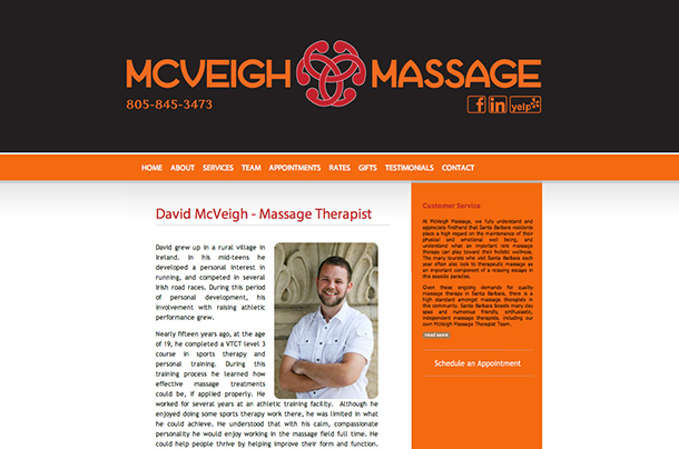 Assisted Santa Barbara massage therapist, David McVeigh, with developing an online business presence with an informative website and details about how to develop and maintain an online marketing presence for great customer service and building up a trusted local brand for his new, independent practice, using non-traditional channels.